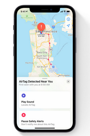 AirTag je možné, stejně jako další zařízení Apple, přepnout do režimu ztraceného zařízení. Jakmile na něj narazí jiné zařízení připojené do sítě, dostanete automaticky upozornění, případně lze nastavit zařízení tak, aby se nálezci objevily vaše kontaktní údaje po přiblížení se s mobilem vybaveným NFC.