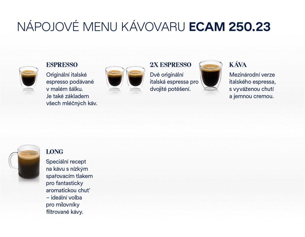 Nastavte si chuť své oblíbené kávyKávovar připraví váš oblíbený nápoj pouhým stisknutím tlačítka. Aby však byla káva připravena vždy podle vaší chuti je možné upravit velikost kávy, intenzitu a požadovanou teplotu a následně uložit do paměti přístroje.