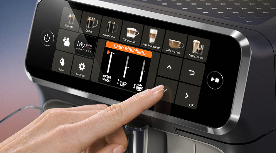 Na dosah jednoho stisknutí tlačítka máte neodolatelnou chuť a aroma kávy z čerstvých zrn. Na intuitivním barevném TFT displeji si snadno vyberete a připravíte svou oblíbenou kávu bez zdlouhavého nastavování.