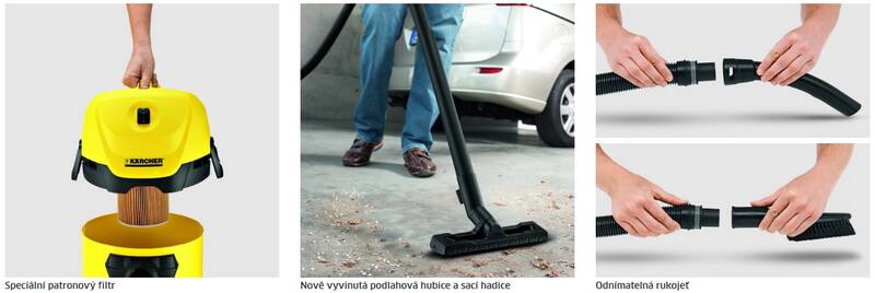 Multifunkční vysavač WD 3 má super sací sílu při spotřebě proudu jen 1000 W. Jeho robustní, nárazu vzdorná plastová nádrž má 17-litrový objem. Patronový filtr umožňuje pohodlné vysávání suchých a mokrých nečistot – a to bez výměny filtru. Nová sací hadice a, na to nesmíme zapomenout, nově vyvinutá podlahová hubice na klipsy se směšovací vložkou zajistí optimální zachycení nečistot a tím dokonalou čistotu. Snadno odnímatelná rukojeť umožňuje montáž příslušenství přímo na sací hadici. Při přerušení práce lze sací trubku a podlahovou hubici díky parkovací poloze pohodlně zaparkovat. Ostatní doplňky jako funkce fukaru, „Pull & Push“ uzavírací systém, ergonomicky tvarovaná rukojeť a velmi praktická úschova kabelů a příslušenství činí úklid s WD 3 skutečným potěšením.