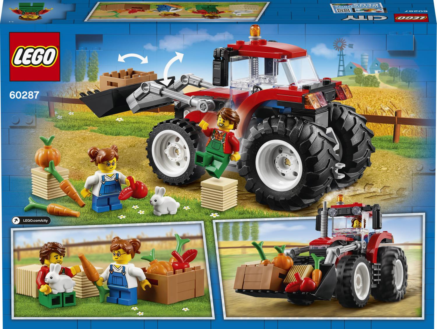 Vydej se na venkov v kultovním LEGO® City traktoru. Díky obřím zadním pneumatikám nečiní traktoru jízda po drsném povrchu žádný problém. Nalož balíky slámy a bednu s dýní, jablkem a mrkvemi na korbu traktoru. Pak je pomocí zdvižného ramene zvedni do vzduchu a dovez je farmáři a jeho dceři – je potřeba nakrmit hladového králíka!