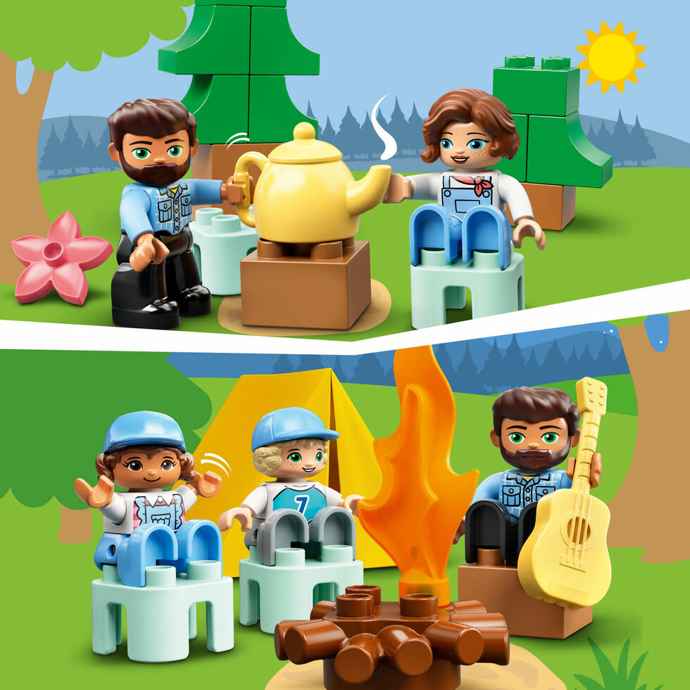 - Obsahuje 4 DUPLO® figurky – muže, ženu, dívku a chlapce – a také karavan s točícími se koly a odnímatelnou střechou, látkový stan, kánoi a spoustu dalších zábavných doplňků.