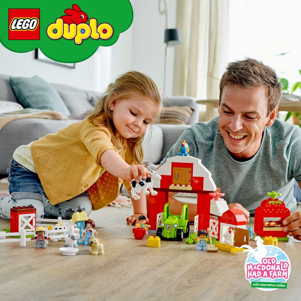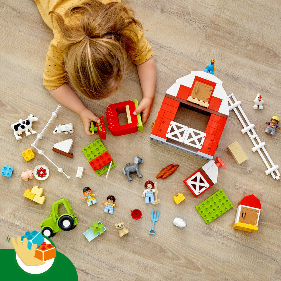 - V sadě najdete traktor, prase, ovci, koně, psa, slepici, kohouta, 2 krávy, 4 LEGO® DUPLO® figurky, sestavitelnou stodolu, realistický balík sena a spoustu parádních doplňků. Když se děti pustí do přehrávání příběhů z farmy, během kterých si vyzkouší, jaké to je krmit zvířata a jezdit na koni, budou rozvíjet jemnou motoriku, sociální a emoční dovednostia kreativní myšlení.