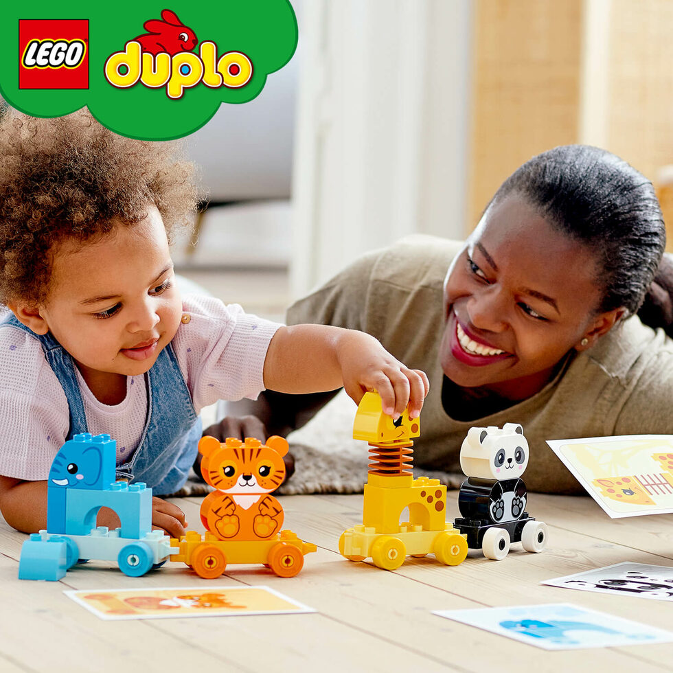 Se slonem, tygrem, žirafou a pandou se malí milovníci zvířat rozhodně nebudou nudit. Mohou stavět a přestavovat model, měnit řazení vagónů a umisťovat do vláčku zvířata a vršit je na sebe. Přitom rozvíjejí jemnou motoriku a zkoumají magický svět kreativního hraní. Inovativní funkce, mezi něž patří i pohyblivý krk žirafy, přispívají k ještě zábavnějšímu zážitku z této edukační sady. Stavitelské kartičky s předlohami modelů ve skutečné velikosti dětem umožňují pokládat během stavění kostky přímo na obrázky. Pro ještě větší porci zábavy mohou děti vláček propojit s ostatními DUPLO modely na kolečkách.