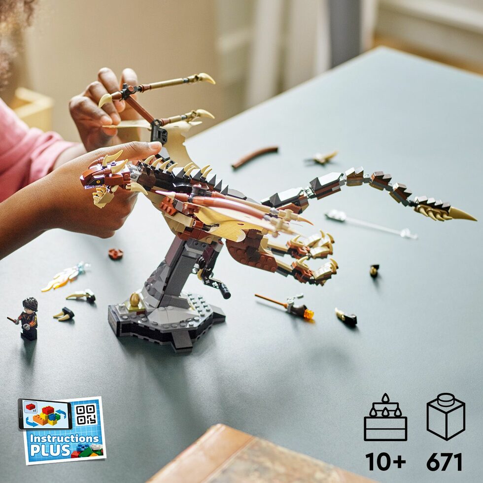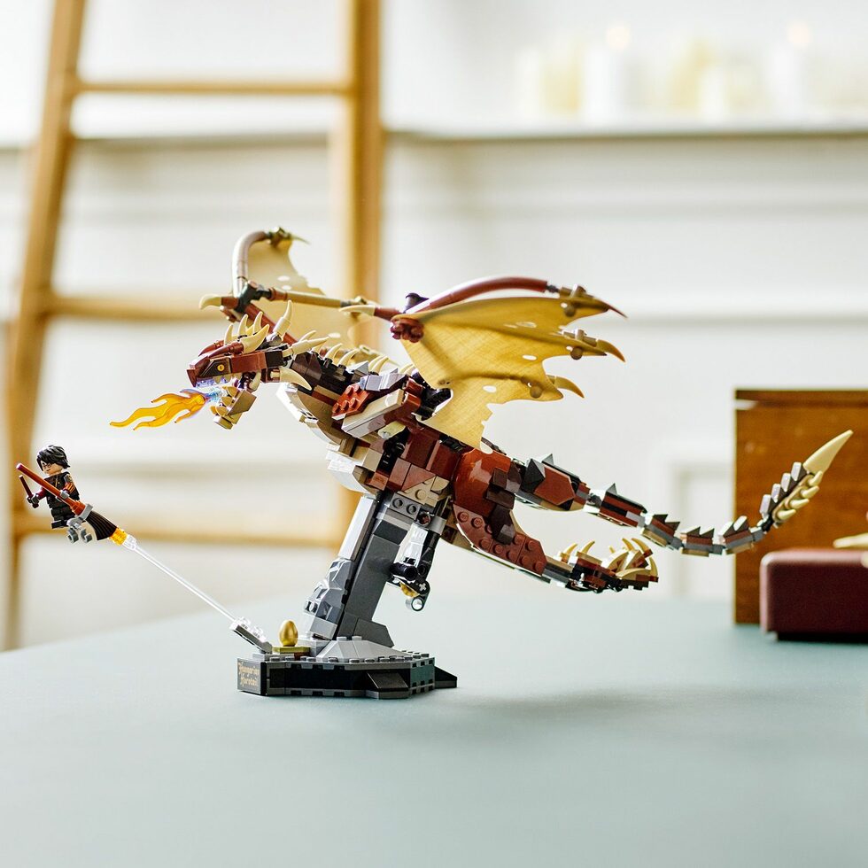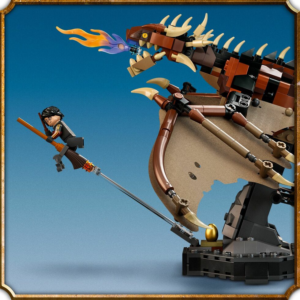Model maďarského trnoocasáho draka z kostek s černými šupinami, špičatým ocasem a ohnivým dechem. Toto ikonické stvoření představuje nejen jedinečný výstavní kousek, ale umožňuje dětem s modelem také létat. Klička na zadní straně slouží k ovládání mechanismu, který pohybuje křídly s rozpětím 40 cm nahoru a dolů. Tento sběratelský model stojí na bytelném podstavci a je doplněn minifigurkou Harryho Pottera na koštěti. Kouzelná je pak i bezplatná aplikace LEGO s návody, která dětem umožňuje si model během stavění přibližovat a otáčet.
