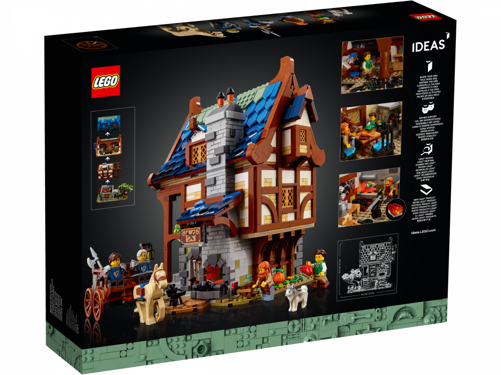 Uteč na chvíli z moderního světa a postav si tento velkolepý výstavní model Středověké kovárny. Architektonické detaily 3podlažní středověké budovy jsou vytvořené z LEGO kostek. Střechu a 2 podlaží lze odejmout pro lepší přístup k plně vybavené ložnici, kuchyni a dílně. Další funkce zahrnují žhnoucí pec se světelnou LEGO kostkou, a k tomu navíc zahradu se sestavitelnými modely jabloně a studny.