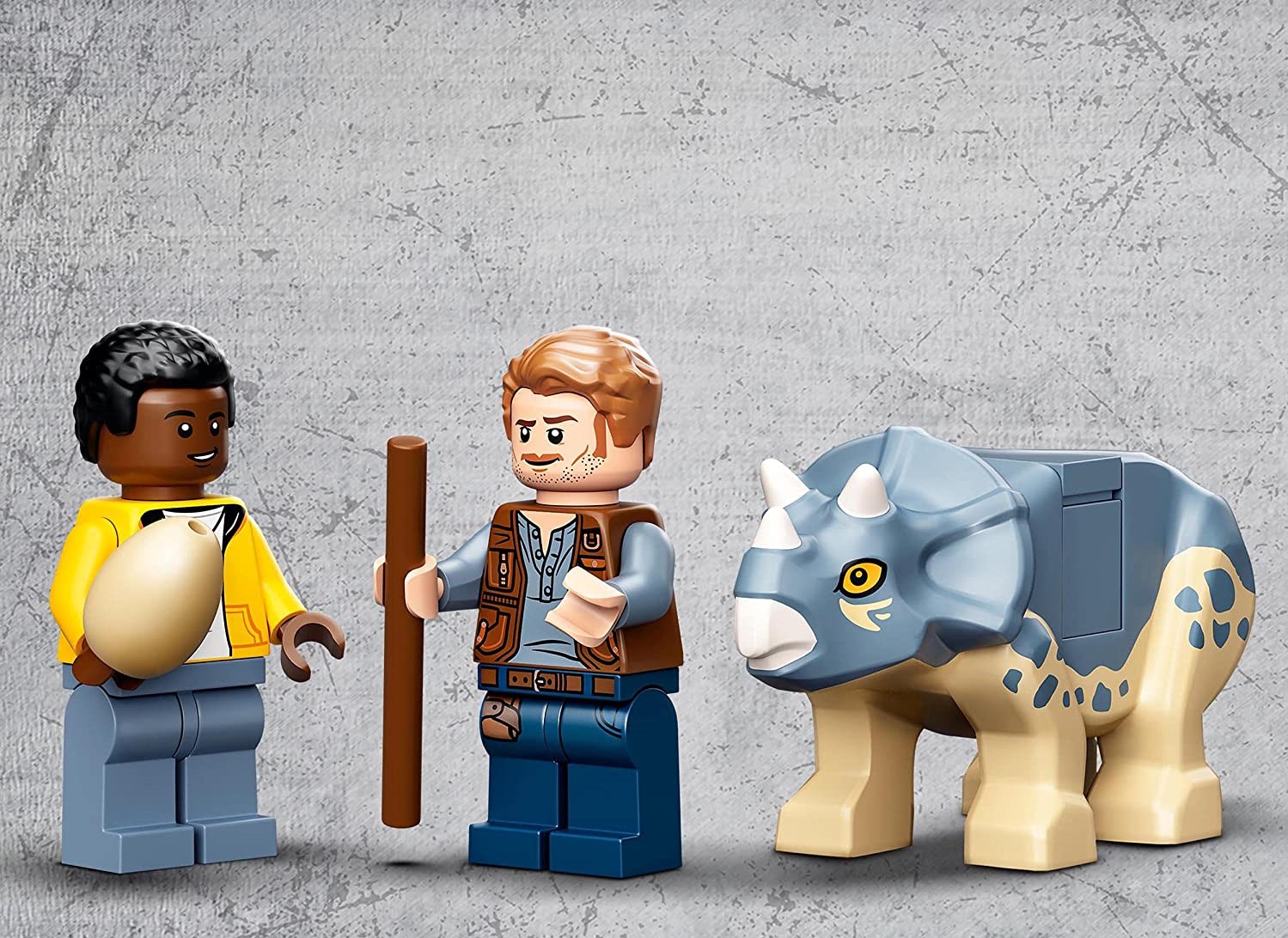 - • 2 LEGO® minifigurky z Jurského světa a figurka mláděte Triceratopse.