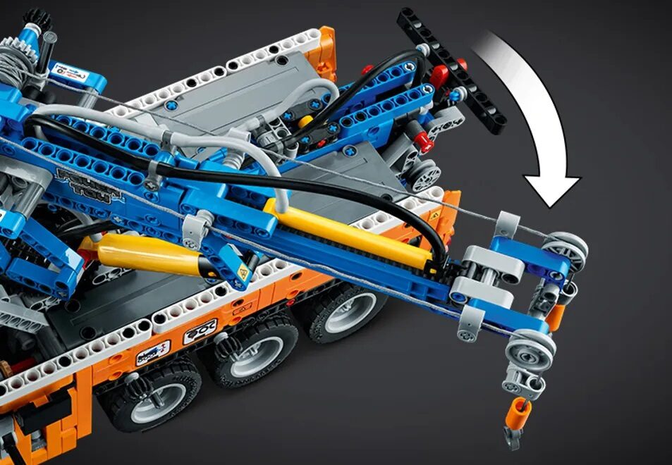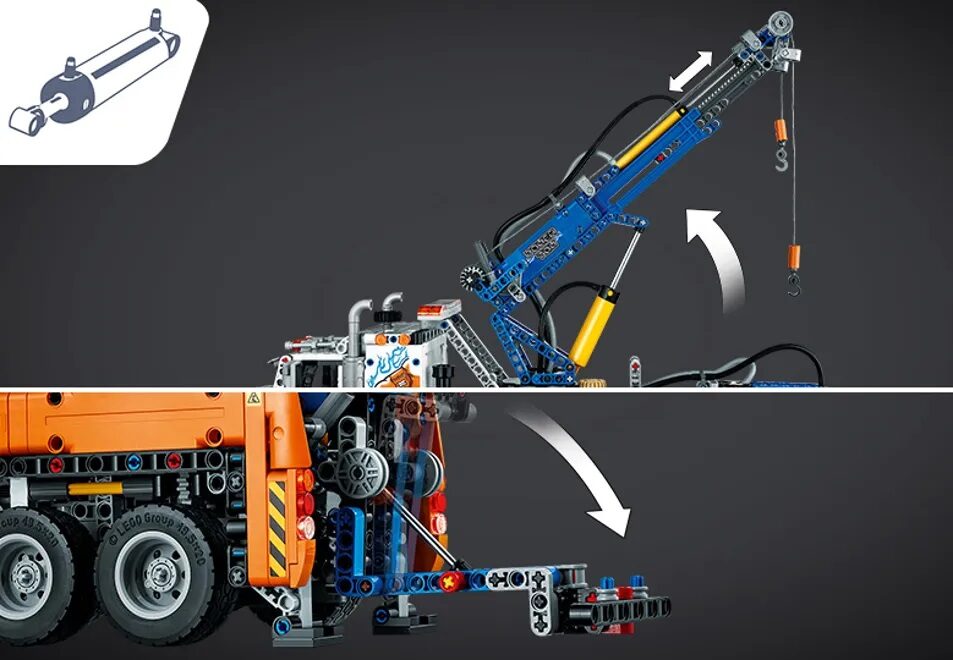 Tento odtahový vůz s jeřábem se pyšní spoustu impozantních doplňků. Otevřete kapotu a prohlédněte si šestiválcový motor s pohyblivými písty. Řiďte vůz s pomocí ovládacího otočného kolíku na střeše. Aktivujte jeřáb, nastavte rameno do polohy, použijte naviják a vysuňte boční opěry. Jedná se také o vůbec první model v historii LEGO Technic, který je vybaven zvedací nápravou, díky níž je možné využít doplňková kola pro lepší rozložení zátěže.