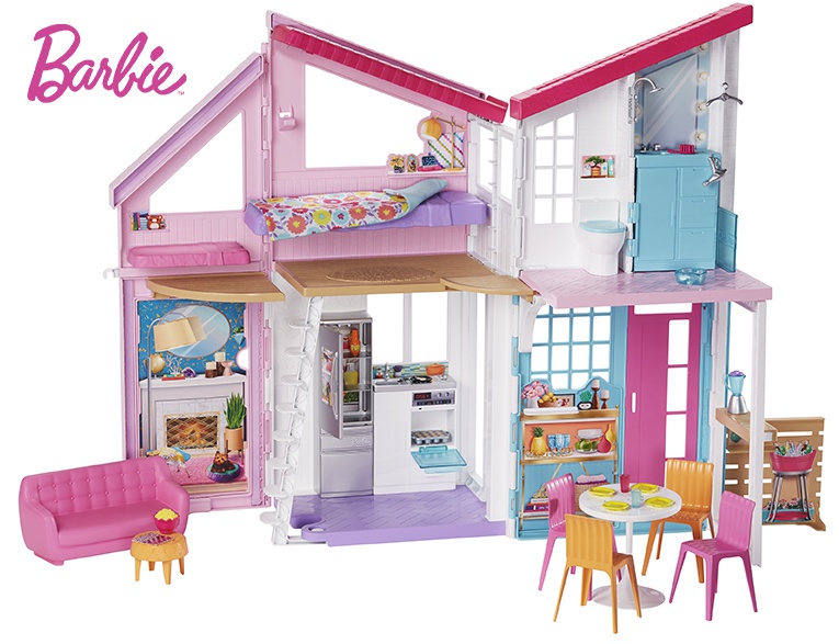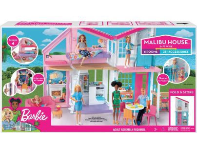 Nevíš co podniknout o prázdninách? A co třeba navštívit tento parádní přenosný dům v Malibu? Pojď se vydat na průzkum. Tento dvoupodlažní domeček ukrývá celou řadu vychytávek. Vstup do obývacího pokoje, který lze snadno změnit v domácí kino. Prozkoumej, co ukrývají lednice a trouba v kuchyni, vychutnej si ovocný koktejl nebo si užij venkovní grilování s přáteli. Odpočiň si na patrové posteli a odhal pokoj pro hosty. Nezapomeň ani na prostornou koupelnu se sprchou, umyvadlem a toaletou. Součástí je samozřejmě i další nábytek jako stůl nebo židle a další menší doplňky. Některé doplňky mají rukojeť, aby je panenka mohla držet v ruce. Jakmile je čas se s hraním rozloučit, ulož všechny doplňky jednoduše dovnitř, domeček zavři a je uklizeno!