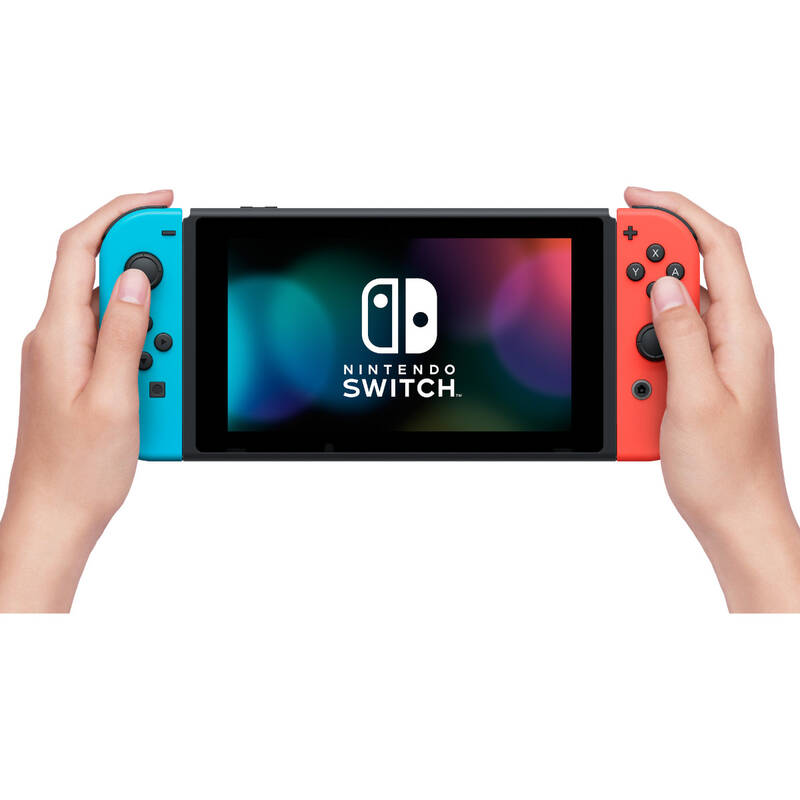 hybridní herní konzole Nintendo Switch • 6,2″ dotykový displej • max. rozlišení 1280 × 720 px (integrovaný displej) • interní paměť 32 GB • procesor NVIDIA Tegra • s dokovací stanicí • HDMI, Wi-Fi, NFC, USB-C • slot pro microSD • vibrační odezva HD rumble • ovládání pomocí Joy-Conů, IR pohybová kamera • lokální multiplayer pro až 8 hráčů • v balení ovladače Joy-Con Neon Red / Neon Blue