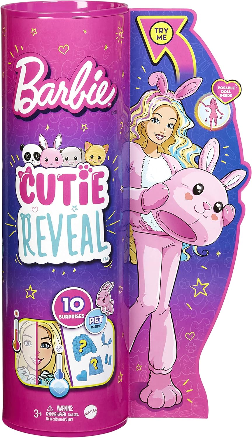 - Otevření krabice s panenkou Barbie Cutie Reveal je díky 10 překvapením v jednom balení opravdu velkolepým zážitkem. Objev uvnitř měkké, plyšové zvířecí kamarády, oblečení a překvapení a užij si zábavné proměny (každý výrobek se prodává samostatně a závisí na dostupnosti).