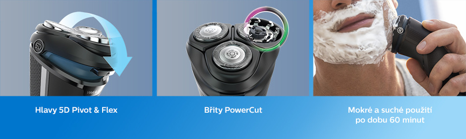 shaver • wireless operation • 60 min operation • 60 min charging • suitable for wet and dry shaving • 5D Flex heads • head rotation in five directions • self-sharpening Powercut blades • LED charging indicator • flip-up trimmer • ergonomic handle • protective cover and travel case in the package