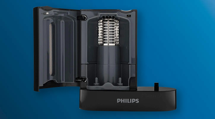 Udržujte hlavice kartáčku Sonicare čisté pomocí speciálně navrženého UV sanitizátoru Philips. Stačí umístit jednu či dvě hlavice kartáčku dovnitř a stisknout tlačítko. Za 10 minut je hotovo. Zničí až 99 % bakterií a virů bez použití chemikálií.