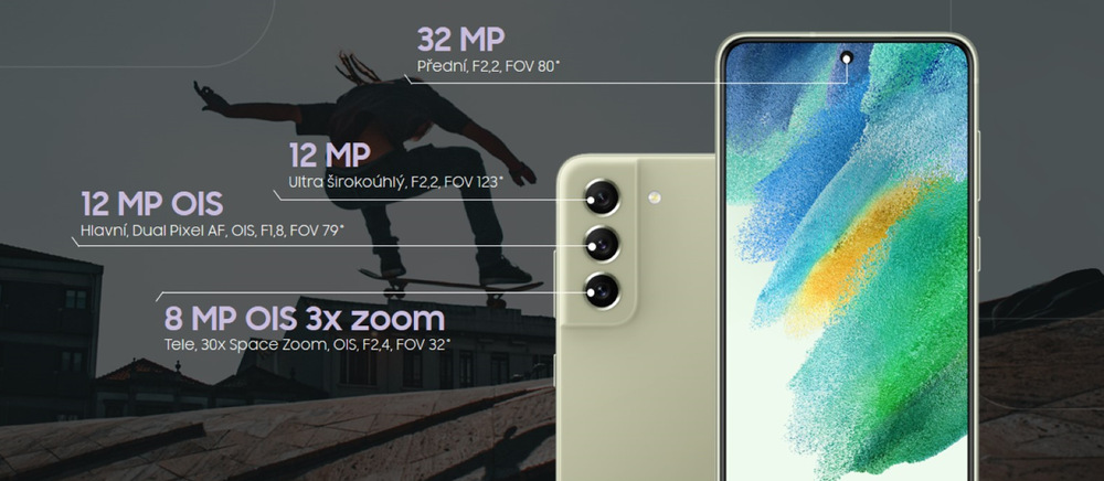 Prvotřídních výsledků dosahuje Galaxy S21 FE i v oblasti fotografování. Na zadní straně má hned tři fotoaparáty (12Mpx hlavní, 12Mpx ultraširokoúhlý a 8Mpx teleobjektiv s 3× zoomem), zatímco vepředu je 32Mpx selfie kamera!
