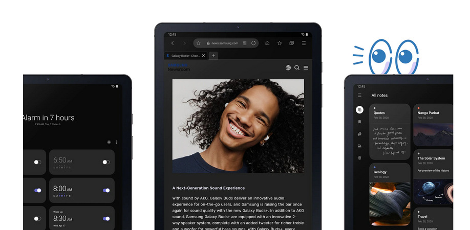Tablet využívá Android 12 vylepšený o nadstavbu One UI 2, která přináší skvělé vychytávky – více funkcí, tmavý režim i efektivnější management baterie pro ještě delší výdrž!