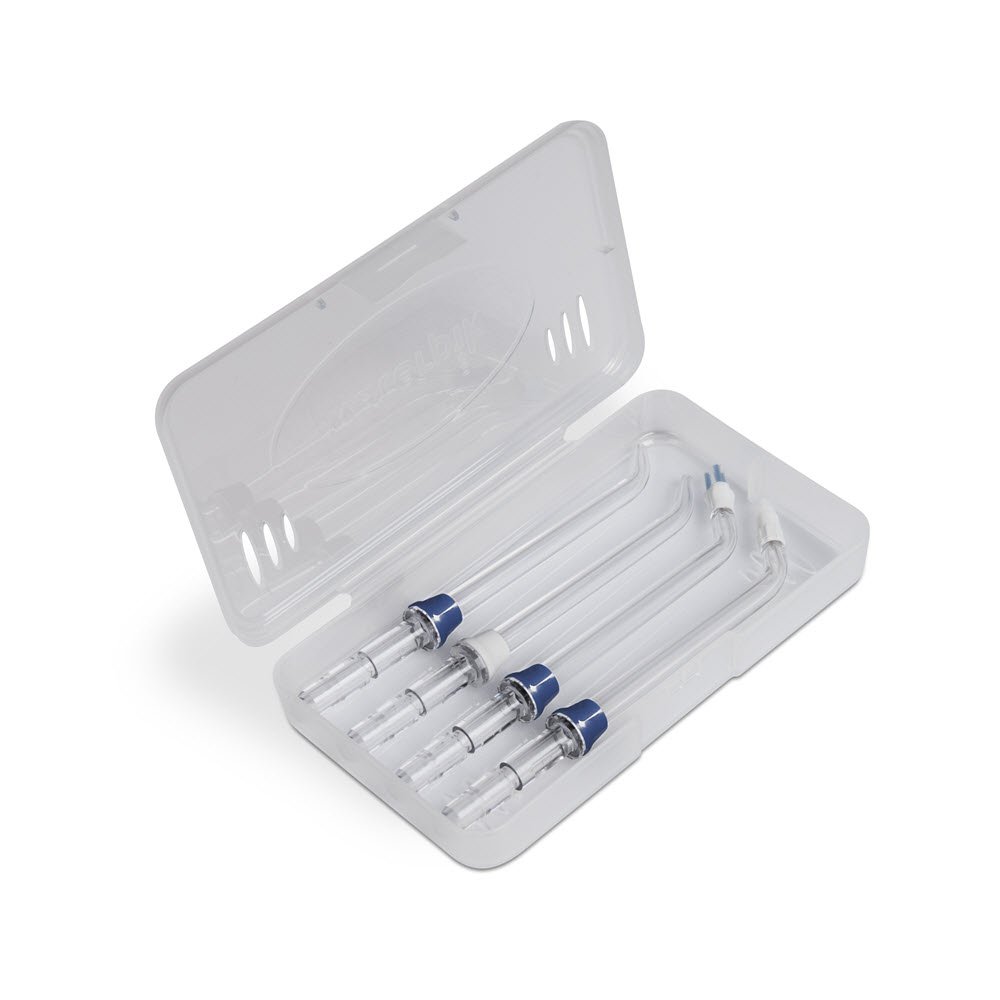 Jednoduše naplňte nádržku, nasměrujte trysku na okraj dásně, nahněte se nad umyvadlo a začněte irigaci. Sprchu je možné nastavit na 3 hodnoty tlaku a v kombinaci se 4 typy trysek je jí možné použít k ošetření různých problémů. Výbava zahrnuje pouzdro k uložení trysek, cestovní taštičku a cestovní zátku.
